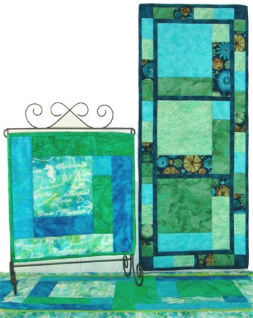 This is our Summertime Blues banner done in Salt Water fabrics by Tula Pink. I have three different seashell stencils to hand quilt in the squares.